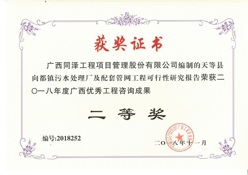 天等县向都镇污水处理厂及配套管网工程可行性研究报告荣获2018年度广西优秀工程咨询成果二等奖
