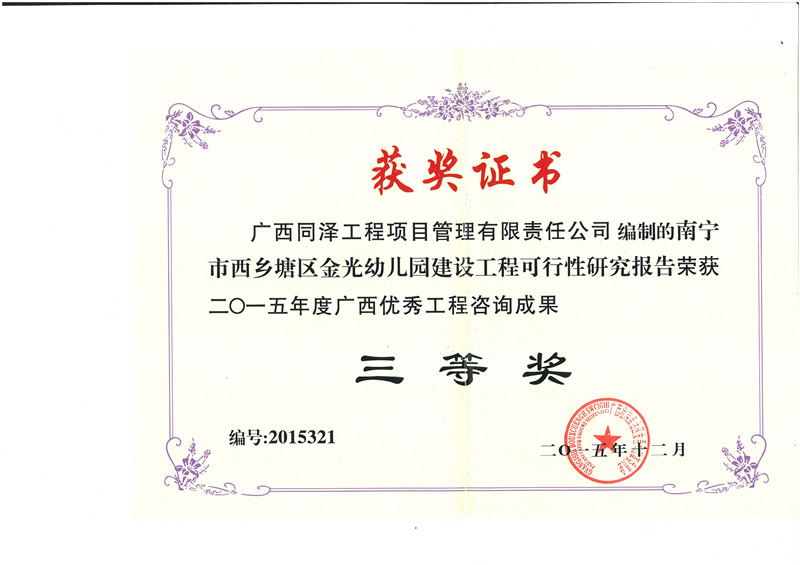 南宁市西乡塘区金光幼儿园建设工程可行行研究报告荣获2015年度广西优秀工程咨询成果三等奖
