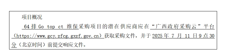 简要规格描述或项目基本概况介绍、用途:64排Go top ct 维保1项。如需进一步了解详细内容,详见竞争性磋商文件。