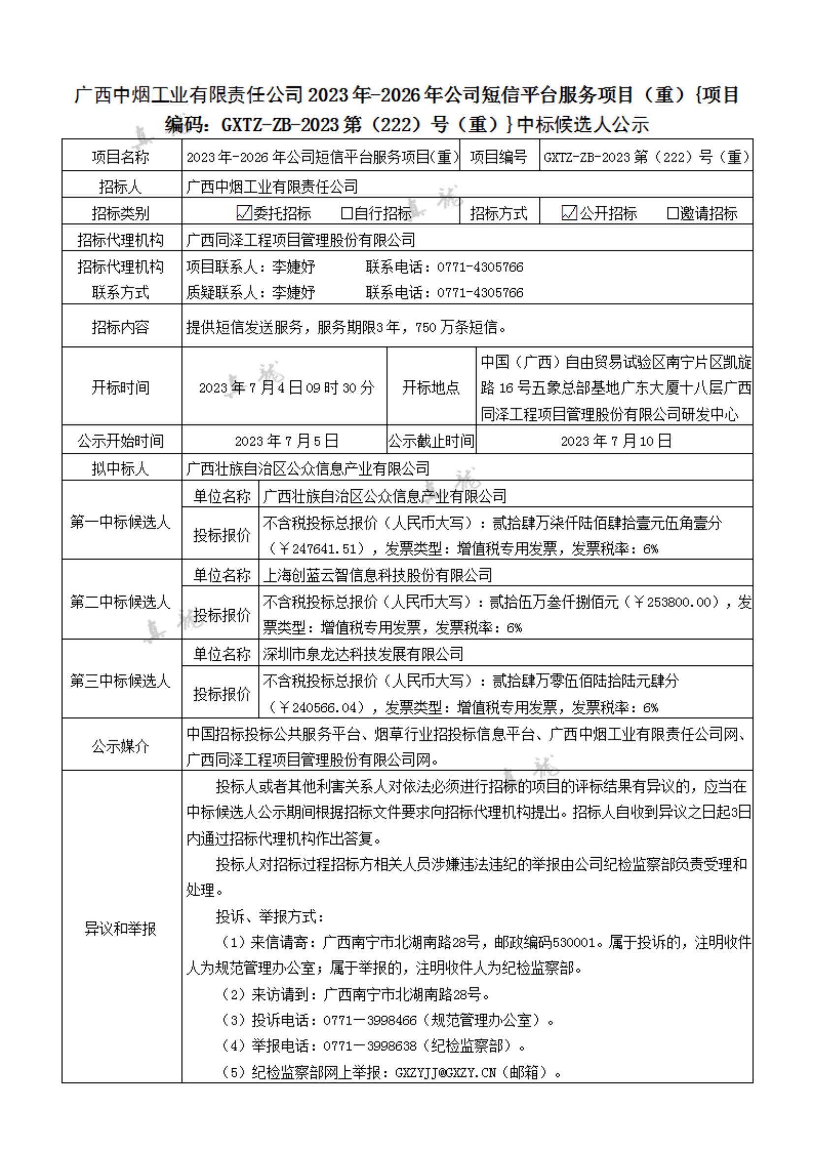 广西中烟工业有限责任公司2023年-2026年公司短信平台服务项目(重){项目编码:GXTZ-ZB-2023第(222)号(重)}中标候选人公示