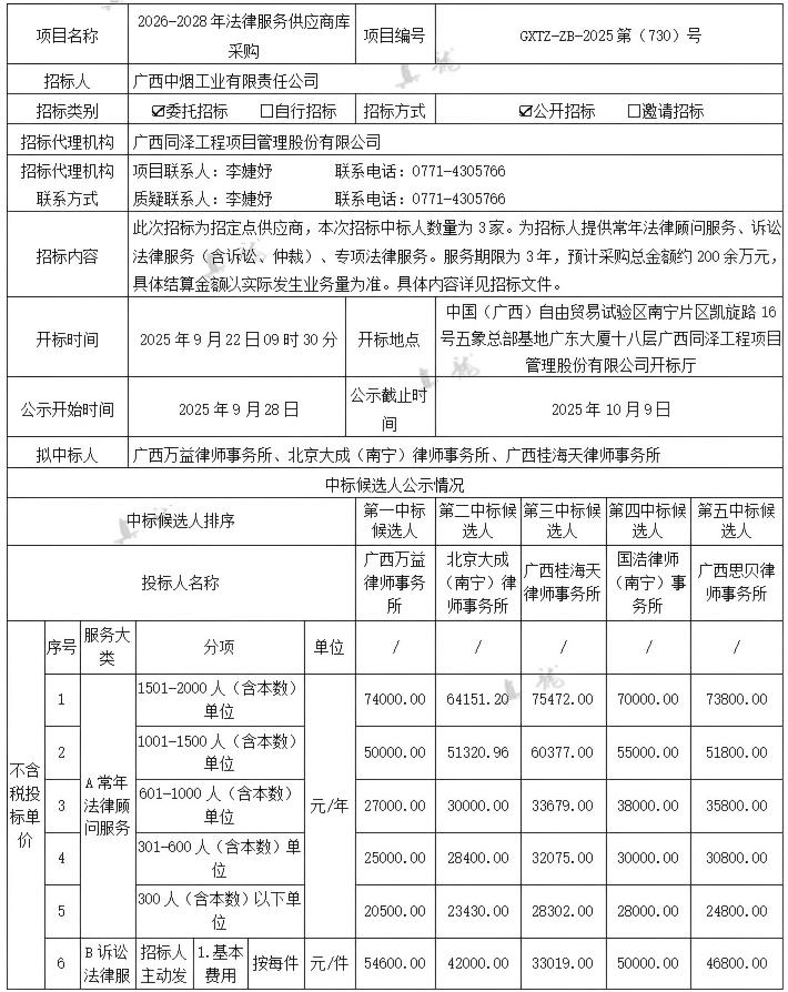 广西中烟工业有限责任公司2026-2028年法律服务供应商库采购(项目编号:GXTZ-ZB-2025第(730)号)中标候选人公示